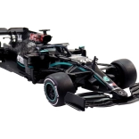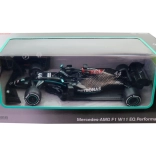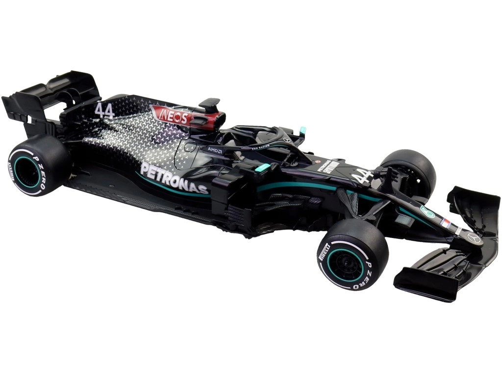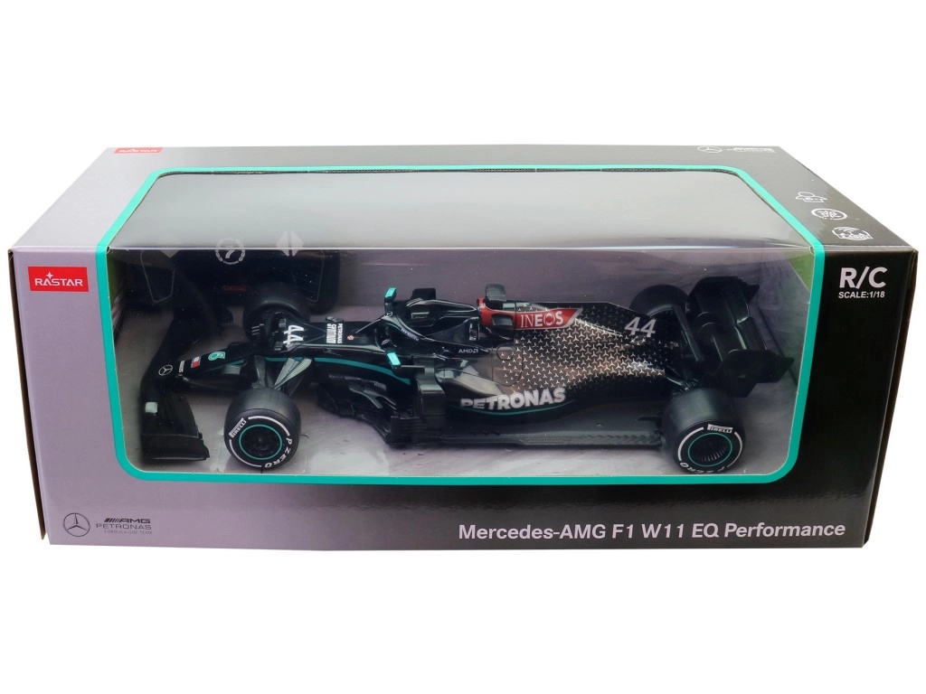 Gedetailleerde aerodynamica, slickbanden en authentieke MERCEDES‑AMG F1 W11 EQ‑kleuren versterken de beleving tijdens het racen en het display op de plank.