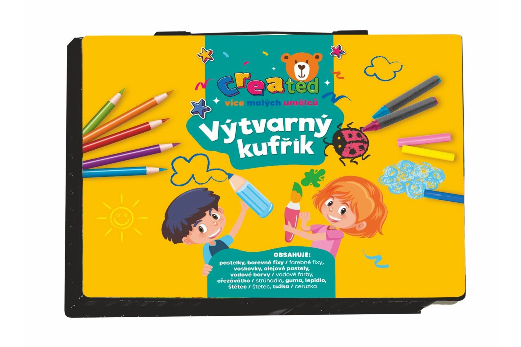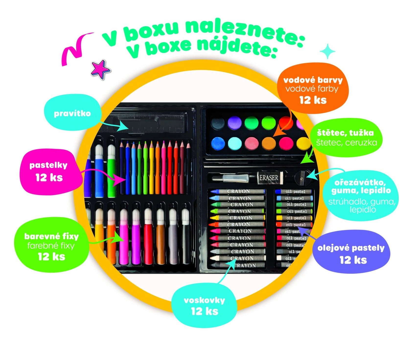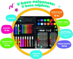 Praktische creatieve set voor kleine kunstenaars in een stevig plastic koffertje, met alles wat nodig is om te schilderen en tekenen. Ideaal voor thuis, de kleuterschool en onderweg. Bevat een gevarieerde selectie hulpmiddelen die de fantasie en fijne motoriek van kinderen stimuleren, waaronder kleurpotloden, viltstiften en waterverf.
