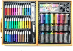Complete set voor kleine en grote makers in een elegante houten koffer. Bevat 150 creatieve hulpmiddelen om te tekenen, schilderen, knippen en plakken – ideaal voor thuis, op school en voor onderweg.