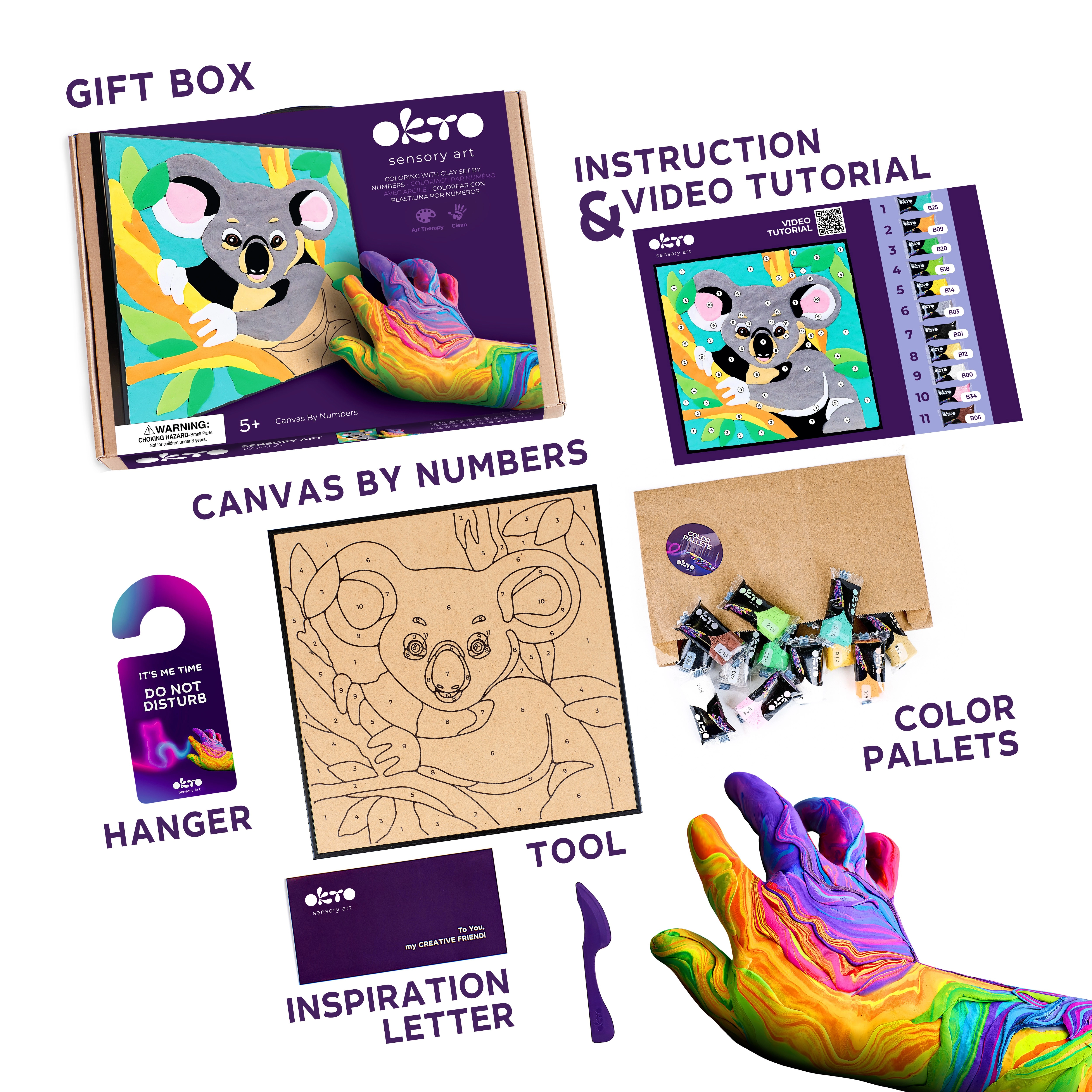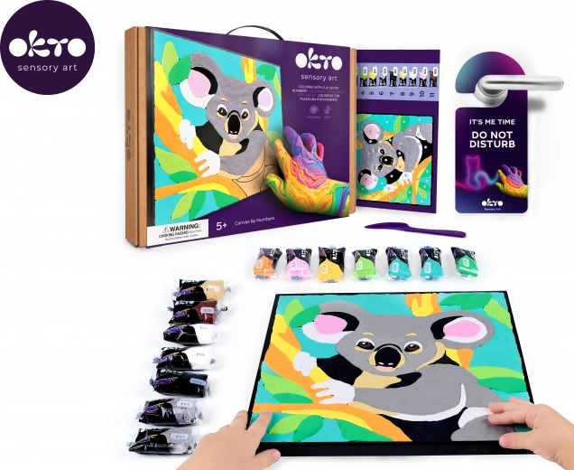Maak je eigen unieke 3D-afbeelding met een koalamotief. De OKTO-set is ontworpen om intuïtief en leuk te zijn – volg simpelweg de nummers en breng de gekleurde massa aan met het meegeleverde modelleergereedschap. Het resultaat is reliëfrijk en decoratief, perfect om tentoon te stellen in een kinderkamer of als een lief cadeau.