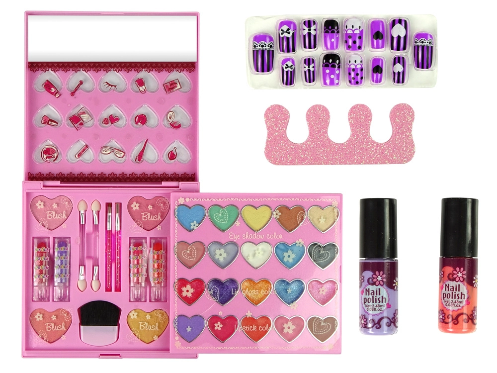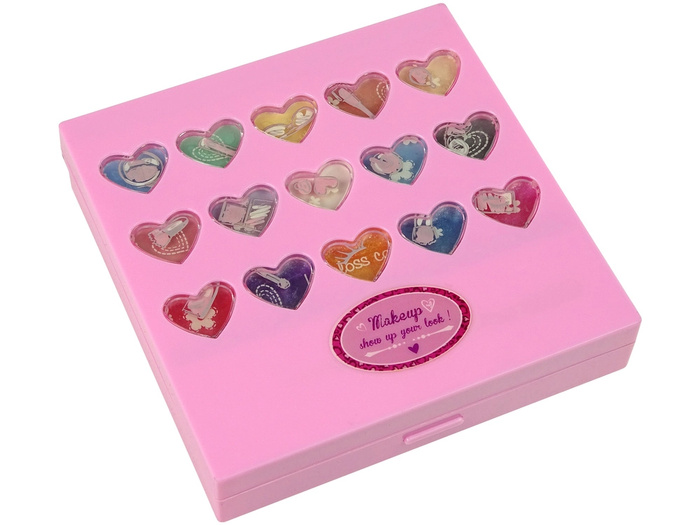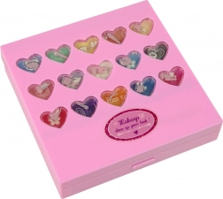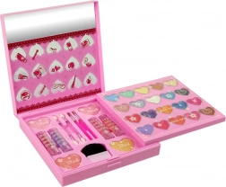 Een betoverend roze palet voor kleine glamqueens met alles voor de eerste, veilige make-up: oogschaduw, lipgloss en lippenstift, blush en nagellak. Dankzij de transparante hartjes zie je het rijke kleurenspectrum, terwijl het compacte ontwerp alle cosmetische accessoires netjes bij elkaar houdt. De cosmetica is parabenenvrij, makkelijk afwasbaar met warm water en zeep en voldoet aan norm EN 71 en heeft CE-certificering.