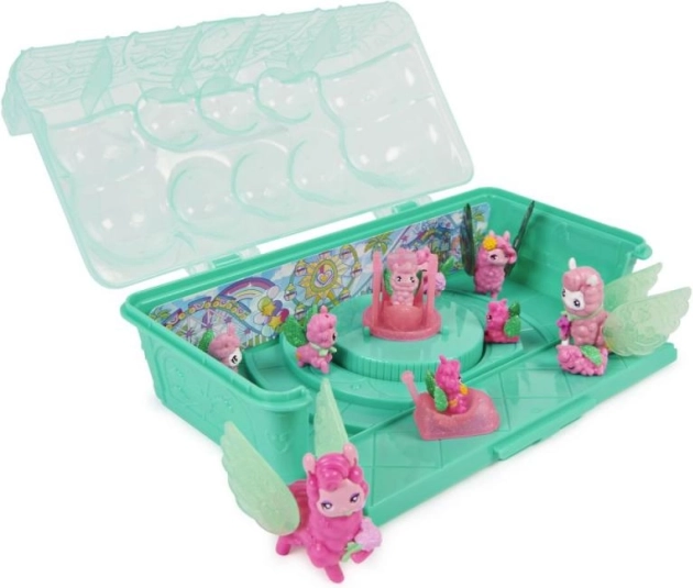 Ontdek de magische wereld van Hatchimals met het familiepakket lama’s, met 10 schattige figuurtjes, 3 uit te broeden baby’s en leuke accessoires. Klap de voorkant van de verpakking open, creëer een thema-achtergrond van een pretpark en geniet urenlang van creatief en verzamelend spel geschikt vanaf 5 jaar.