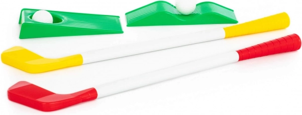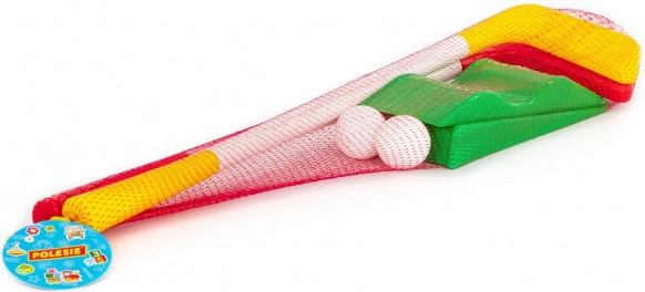 De kinderset bevat kunststof clubs met een rode en gele kop, licht van gewicht en makkelijk te hanteren.
