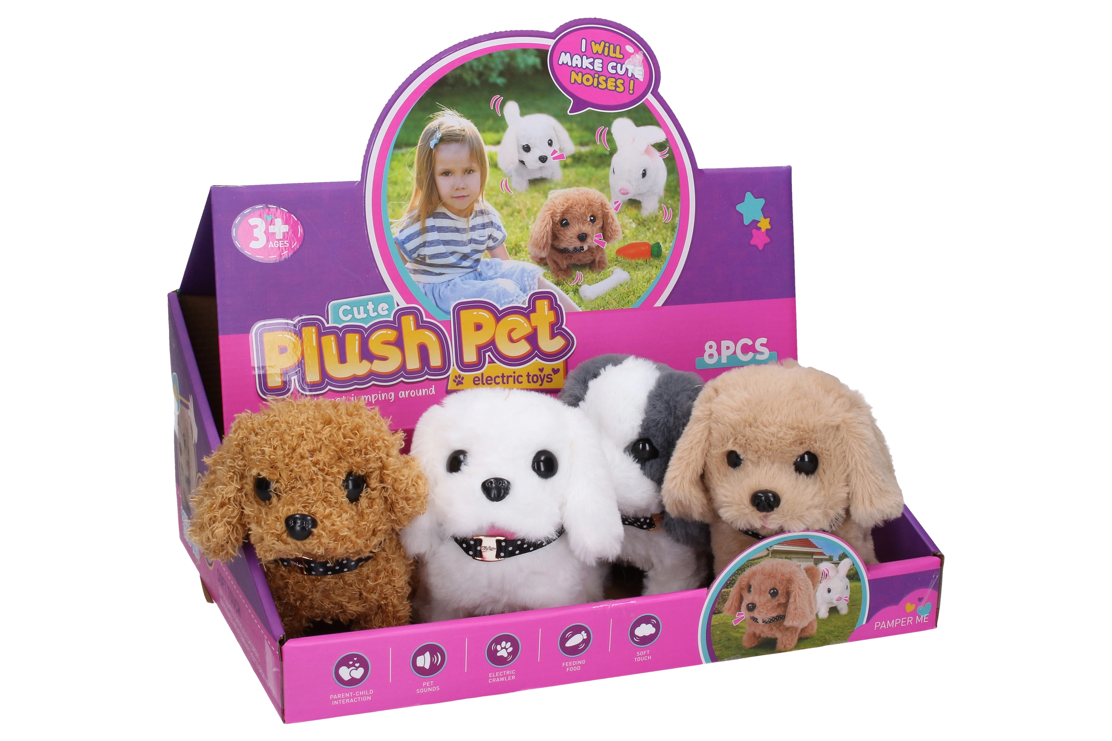 Een schattige wandelende pluchen hond van 16 cm brengt kinderen veel plezier. Na het inschakelen loopt hij, kwispelt hij en blaft. Verkrijgbaar in 3 kleuren (wit, bruin, geel). Eenvoudige bediening dankzij de ON/OFF-schakelaar aan de onderzijde. Werkt op 2× AA-batterijen (niet inbegrepen).