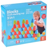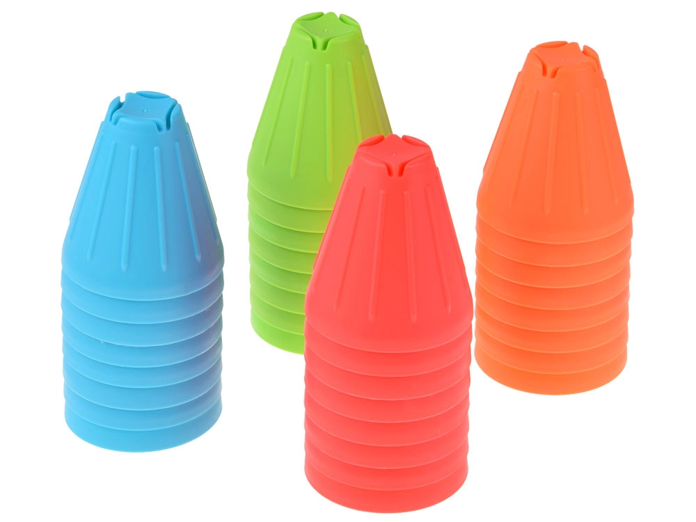 Deze veelzijdige set zorgt voor uren actieve pret. De conische bekers in heldere kleuren (groen, blauw, oranje, rood) zijn licht, duurzaam en dankzij hun vorm uitstekend te stapelen en te nesten. Het geribbelde buitenoppervlak verbetert de grip, terwijl gevormde binnenuitsparingen het stabiel verbinden van elementen vergemakkelijken.