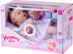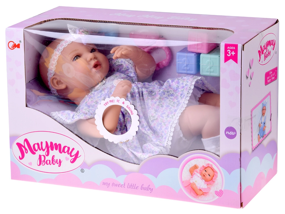 In de pop bevindt zich een geluidsmodule die bij indrukken typische babygeluiden afspeelt: lachen, brabbelen (2 varianten), snurken, “mama”, huilen, niezen, “papa”, hoesten en de hik. De module wordt gevoed door CR2032-batterijen (inbegrepen), zodat kinderen direct na het uitpakken plezier kunnen hebben.