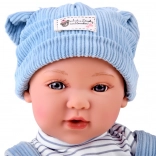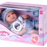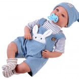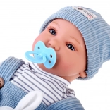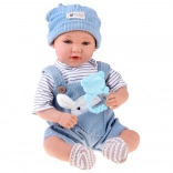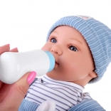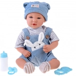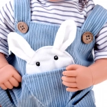 Schattige interactieve baby met realistische details en een zacht buikje voor uren creatief spel. Dankzij de geluidsmodule maakt de pop verschillende babygeluidjes; inbegrepen zijn een flesje, speen en rammelaar. De outfit bestaat uit een zachte blauwe corduroy tuinbroek met een konijntje op het zakje, een gestreept shirt, sokken en een mutsje.