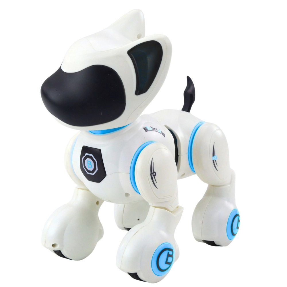 Schattige interactieve hond in wit-blauwe uitvoering biedt kinderen uren speelplezier én leren. Dankzij de afstandsbediening beweegt de hond in alle richtingen, kan lopen en dansen, maakt realistische blafgeluiden en speelt muziek en heeft ook een geluidsdemping voor comfortabel spelen. Gemaakt van duurzame en veilige materialen, ideaal als cadeau voor kleine dierenliefhebbers.