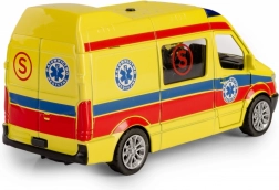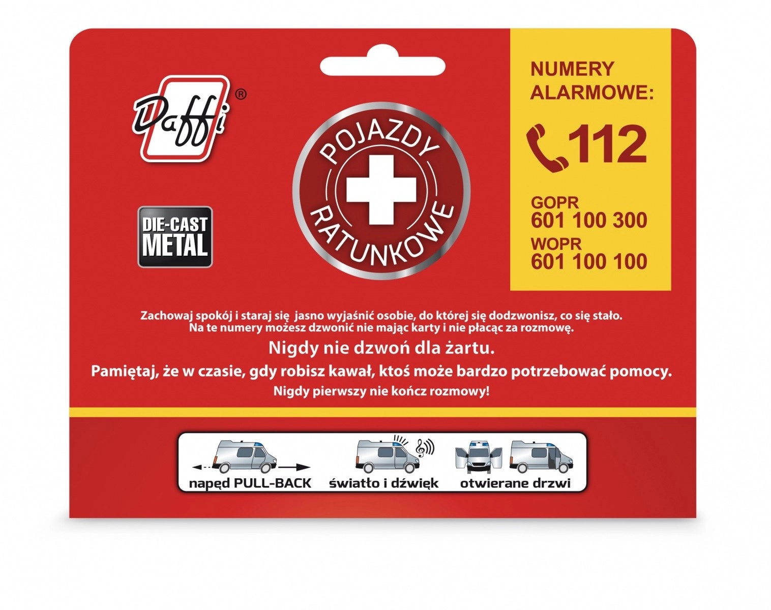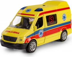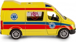 Metalen model van een ambulancebusje met kunststof onderdelen, voorzien van pull-back aandrijving, openende deuren en licht- en geluidseffecten. Een geweldige keuze voor jonge fans van hulpdiensten en verzamelaars.