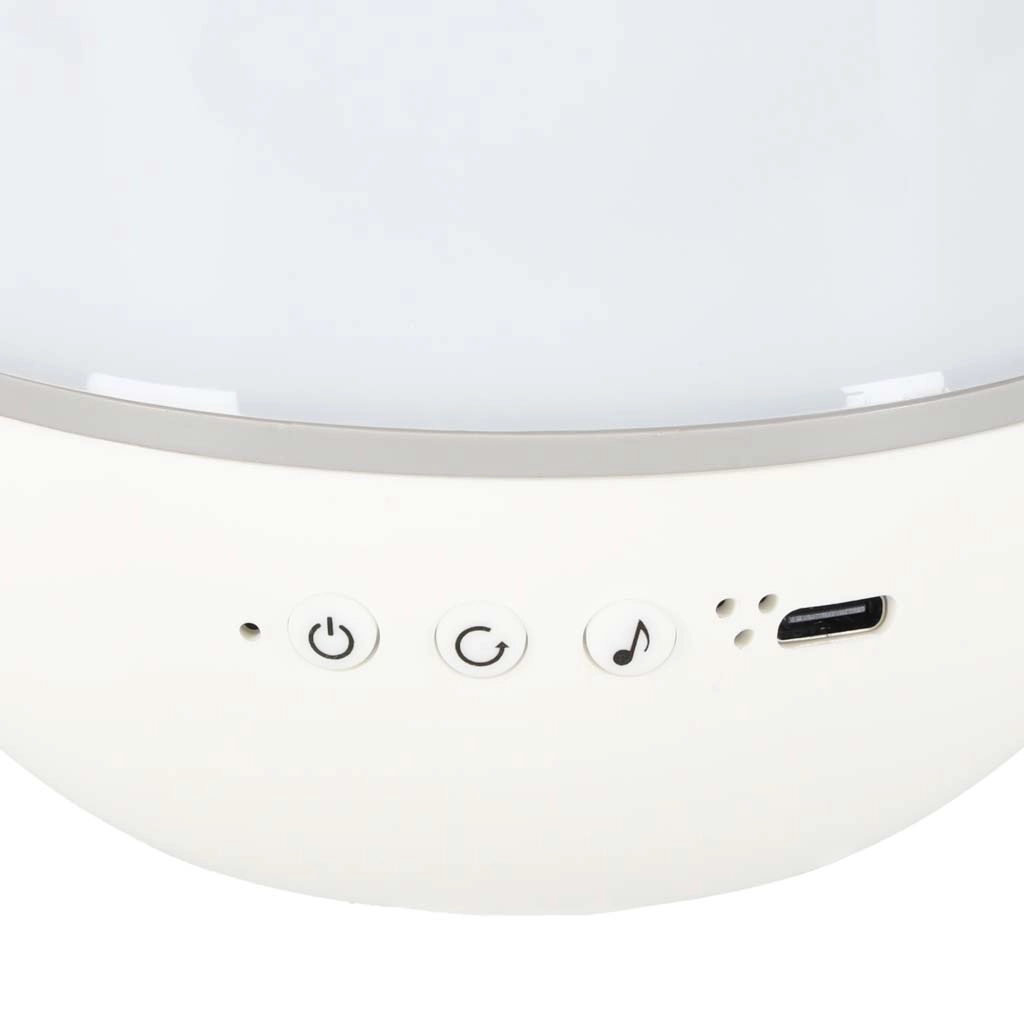 De praktische afstandsbediening laat je in- en uitschakelen, de kleur en helderheid wijzigen, muziek starten pauzeren, het volume regelen, rotatie activeren en de timer op 15/30 min instellen. De ingebouwde 1200 mAh-accu zorgt voor 4–5 uur gebruik; opladen gebeurt via USB 5 V.