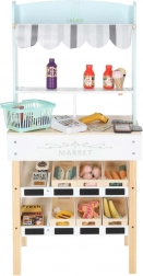 Stijlvolle houten marktkraam voor kleine verkopers die urenlang creatieve speelpret biedt. Dankzij de stevige houten constructie, 6 legplanken met mandjes, kassa, scanner en betaalkaart kunnen kinderen winkelen alsof ze in een echte supermarkt zijn. Inbegrepen is een uitgebreide set accessoires – fruit, groenten, vis, desserts en dranken, een mandje en speelgeld, die fantasie, sociale vaardigheden en fijne motoriek stimuleren.