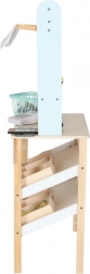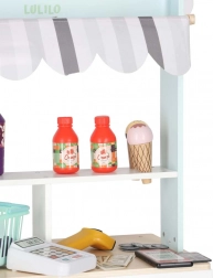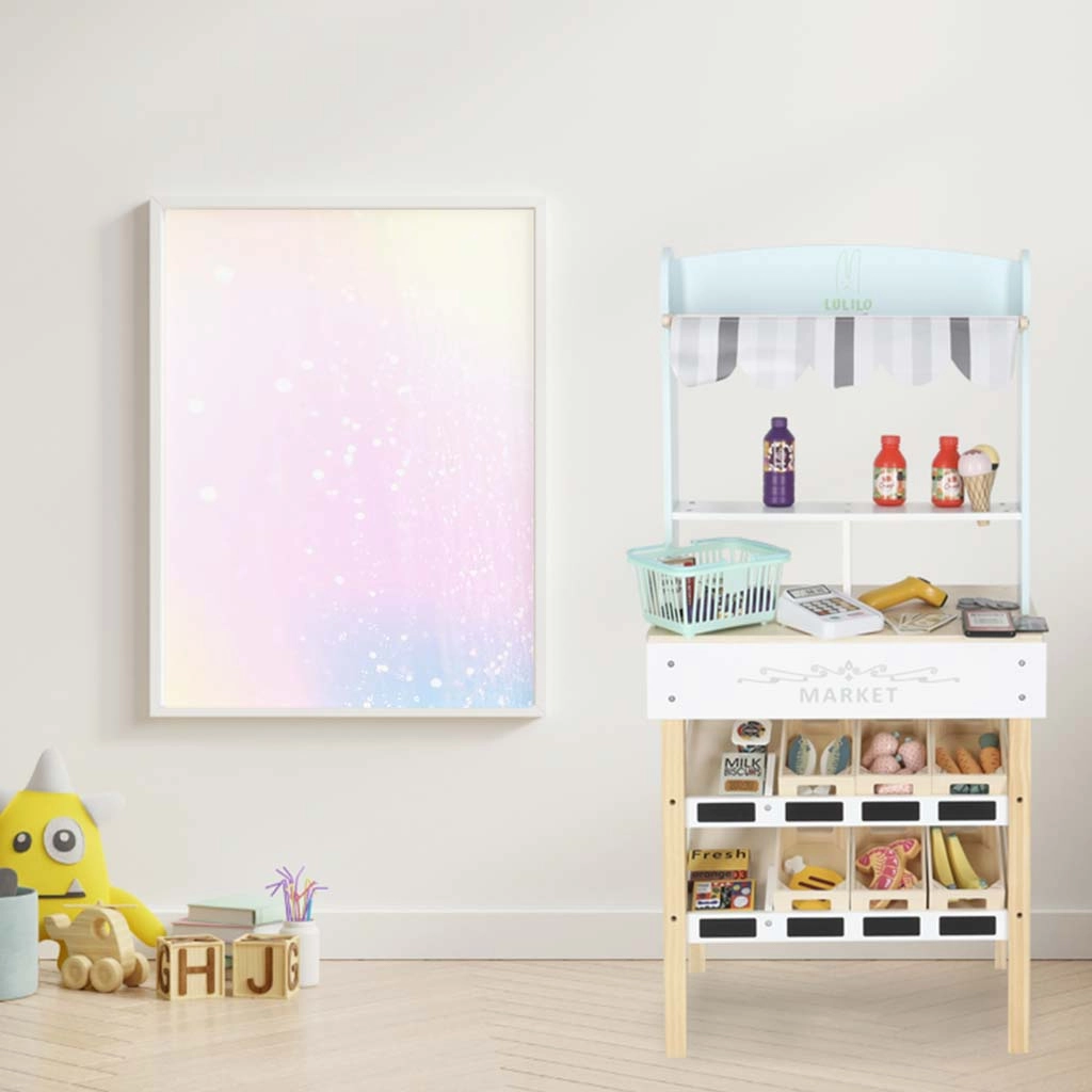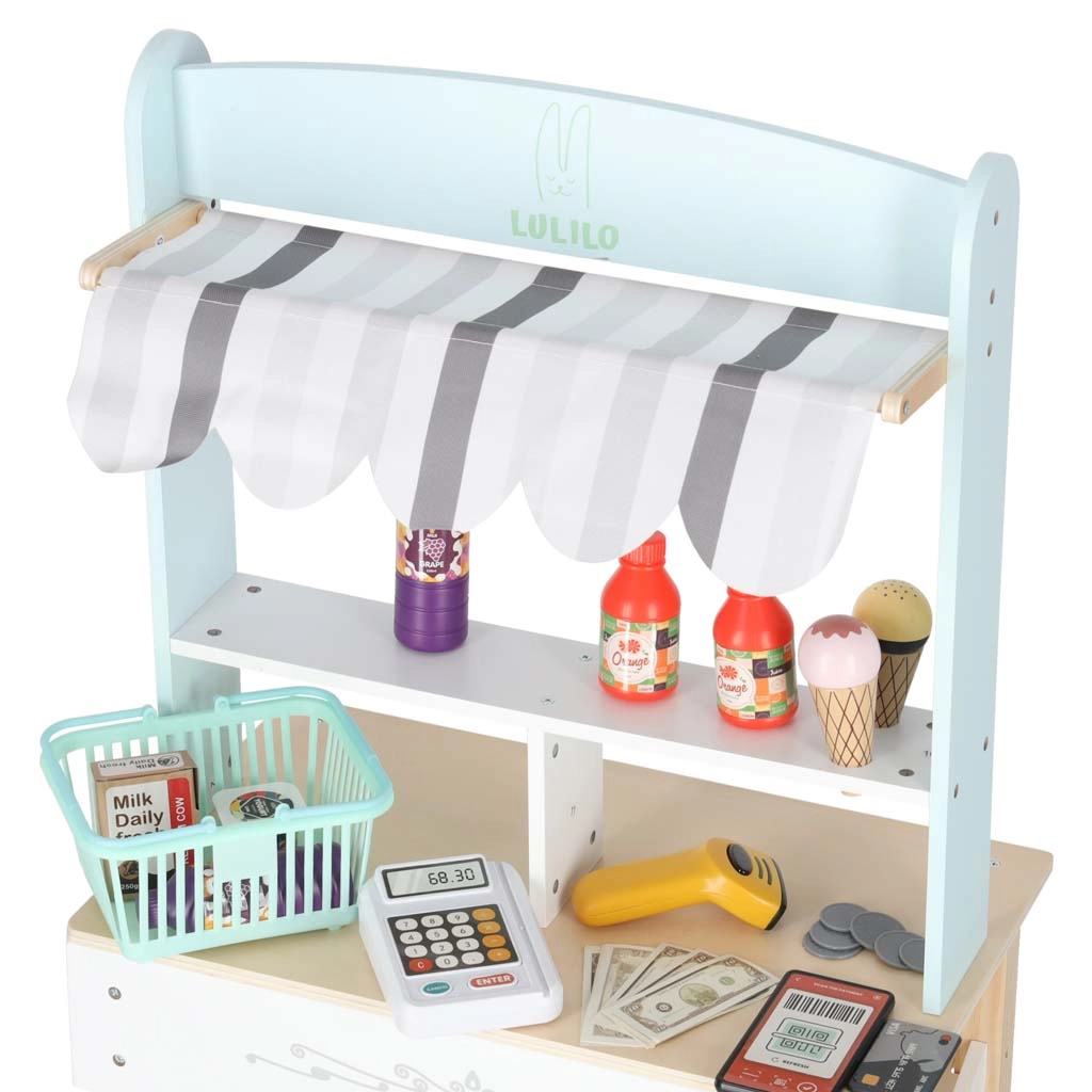 De houten kinderstand LULILO Melo is een prachtig uitgewerkt speelgoed met een stoffen luifel in zachte kleuren, waarmee de kinderkamer verandert in een kleine supermarkt. Hij biedt een stabiele MDF-constructie, praktische opbergmandjes en een overzichtelijke toonbank voor het afrekenen.