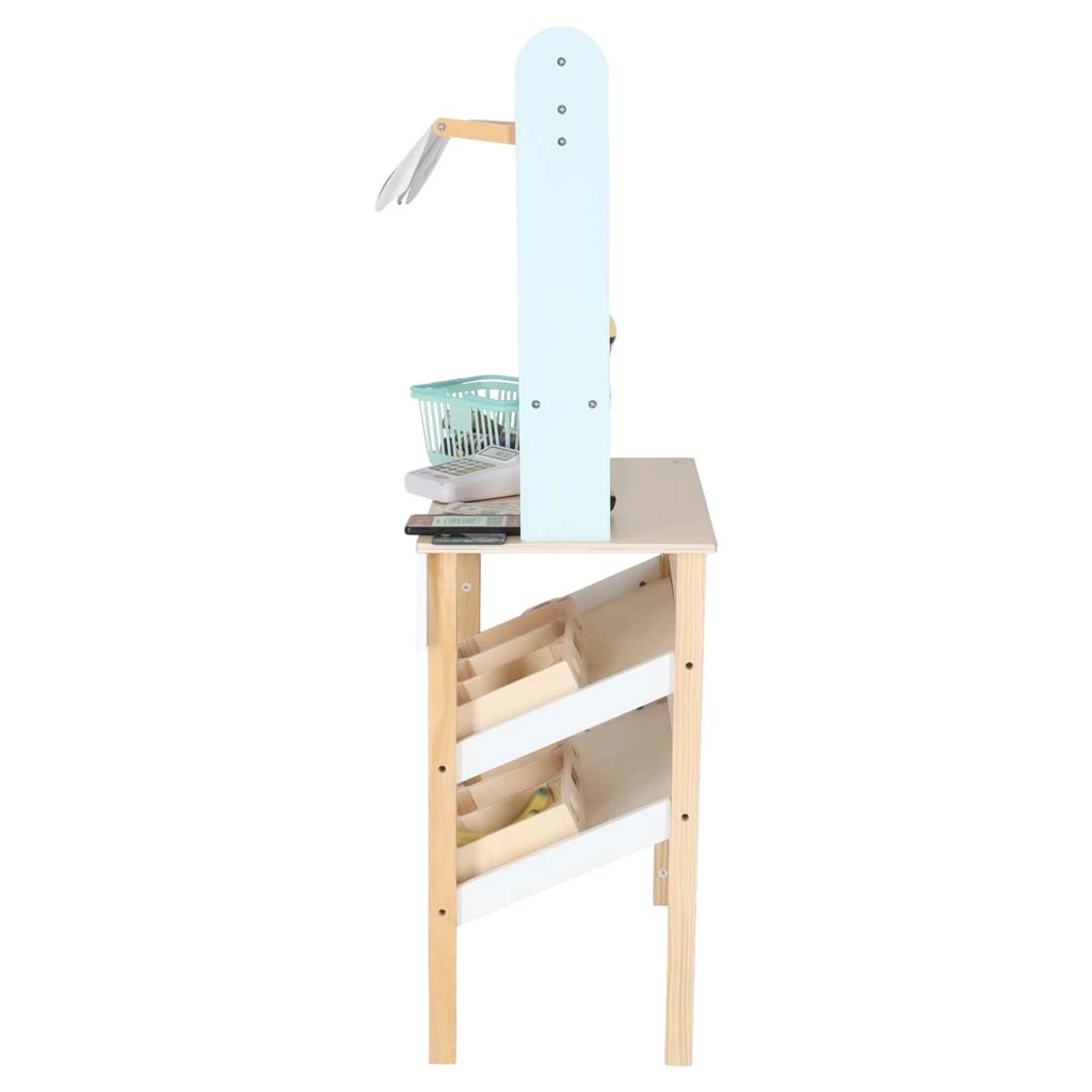 De uitgebreide set accessoires omvat een kassa met knoppen, handscanner, betaalkaart, papieren bankbiljetten en plastic munten, een winkelmandje en diverse etenswaren (fruit, groenten, vlees, vis, yoghurt, koekjes, pizza en ijs). Kinderen leren de basis van tellen, handel drijven en communiceren.