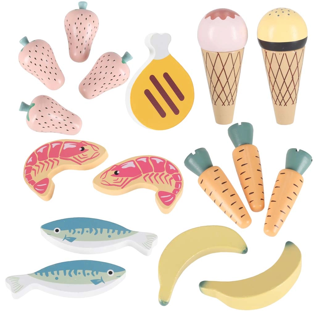 - kraam met 6 planken, kassa, scanner, betaalkaart, speelgeld (bankbiljetten 5/10/25, munten 5/10/20), winkelmandje, etenswaren (garnalen ×2, aardbeien ×4, wortels ×3, vlees, vis ×2, bananen ×2, druiven- en sinaasappelsap ×2, fruitsnack, melkkoekjes, pizza, yoghurt ×2, melk, ijs ×2)