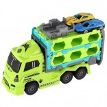De vrachtwagen is verkrijgbaar in meerdere frisse kleuren en valt op door opvallende details en opbergslots voor de autootjes.
