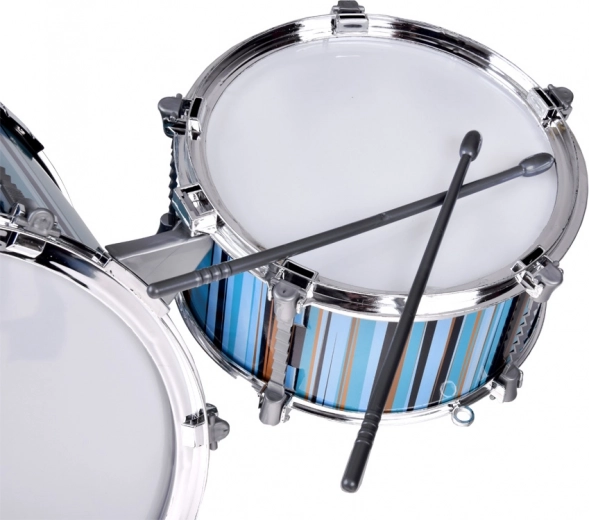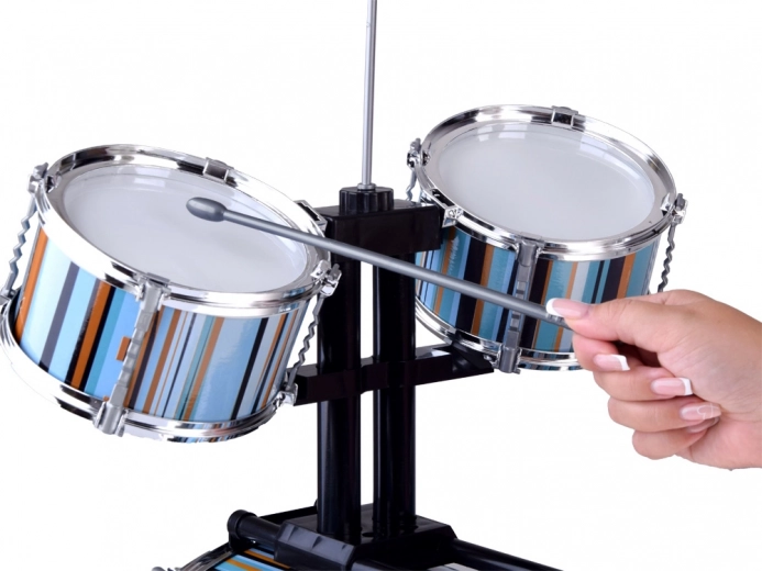 Ontdek het leuke en leerzame kinderdrumstel in blauw–turkooizen tinten, dat ritme, creativiteit en coördinatie ontwikkelt. De lichte constructie is aangepast aan kleine drummers en wordt geleverd met een krukje, drumstokken en een baskick met pedaal voor een realistische speelervaring.