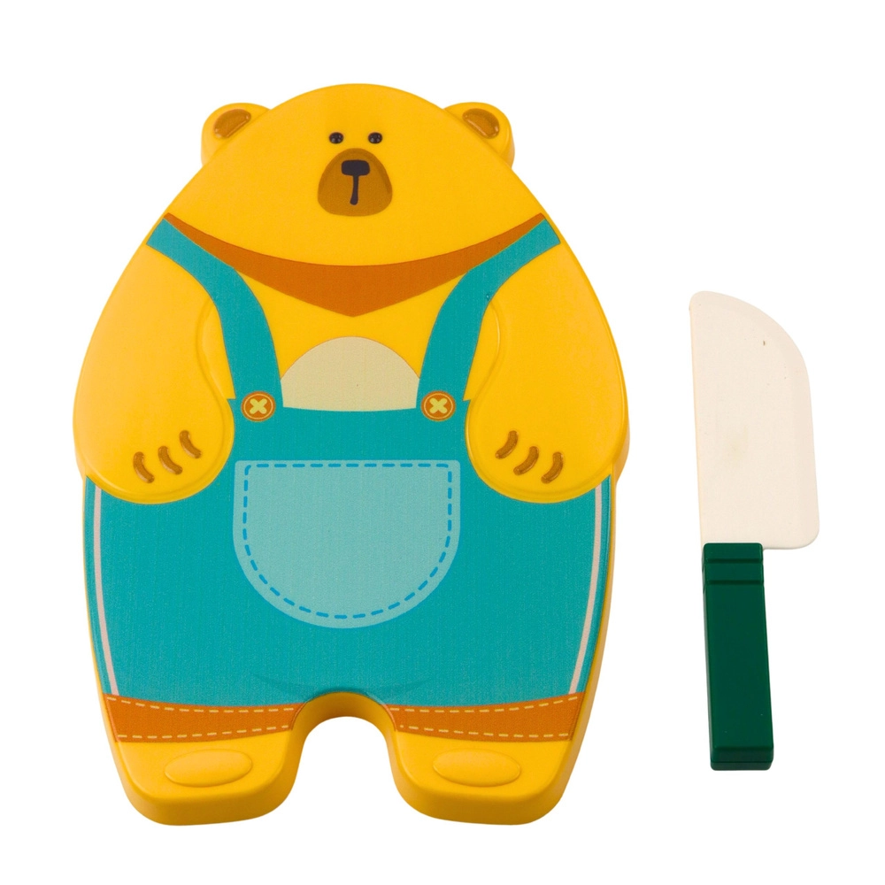 Een stabiel snijplankje in de vorm van een beertje en een licht, veilig mesje creëren een authentieke keukensfeer voor kleine koks.