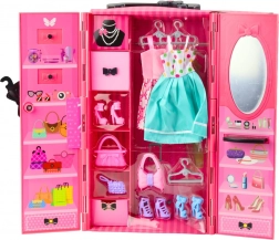 - pop 30 cm; roze kledingkast; 2 jurken; hangers; schoenen; handtassen; spiegel; originele verpakking