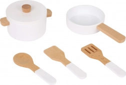 3 houten keukengereedschappen, handdoek, zoutvaatje, pepervaatje, 2 pannen met deksel