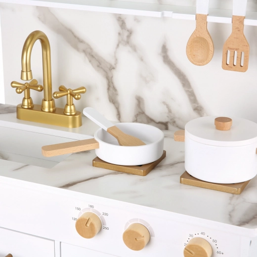 Stijlvolle houten kinderkeuken in het wit met een elegant marmerdesign, perfect voor kleine chef-koks vanaf 3 jaar. Biedt realistische functies zoals een gouden gootsteen met kraan, een kookplaat met draaiknoppen en een oven met transparante deur. Inclusief rijk accessoirespakket voor creatief rollenspel dat fijne motoriek, coördinatie en fantasie stimuleert.