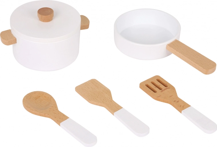 De set bevat alles wat kleine koks nodig hebben: een gouden gootsteen met kraan, een kookplaat met draaiknoppen, een oven met transparante deur, 3 houten keukengereedschappen, een handdoek, een zoutvaatje, een pepervaatje en twee pannen met deksel. Het materiaal is van 100% FSC-gecertificeerd hout voor veilig en duurzaam speelplezier.