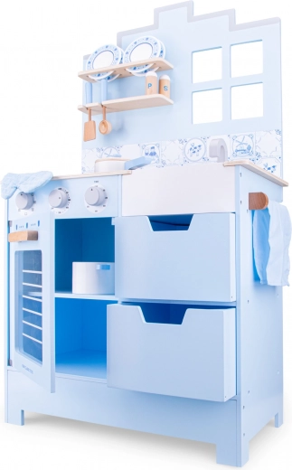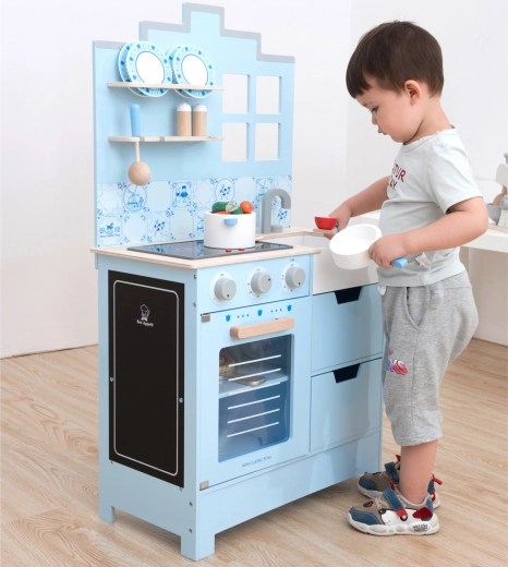 Deze elegante kinderkeuken in lichtblauwe uitvoering creëert de ideale setting voor fantasierijk “koken”. Er is een spoelbak met kraan, een oven met kijkraam, een magnetron en meerdere praktische plankjes en lades voor het opbergen van accessoires. Realistische details zoals draaiknoppen, ovendeurtjes en hangend keukengerei prikkelen de zintuigen en stimuleren zelfstandigheid.
