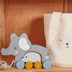 Schattig houten trekspeelgoed met een olifantenfamilie van hoogwaardig hout, ondersteunt de eerste stapjes en de fijne motoriek. Grotere olifant met uitneembare baby, zacht katoenen koord en gladde, veilige afwerking maken dit speelgoed tot de ideale metgezel voor kleine ontdekkers vanaf 12 maanden.
