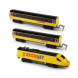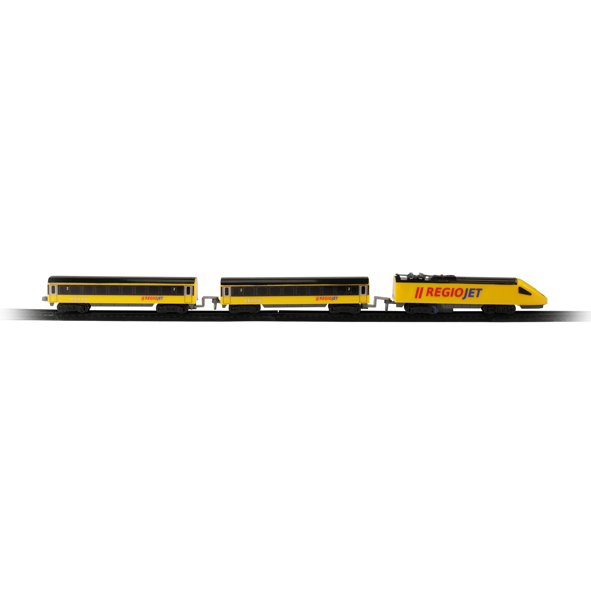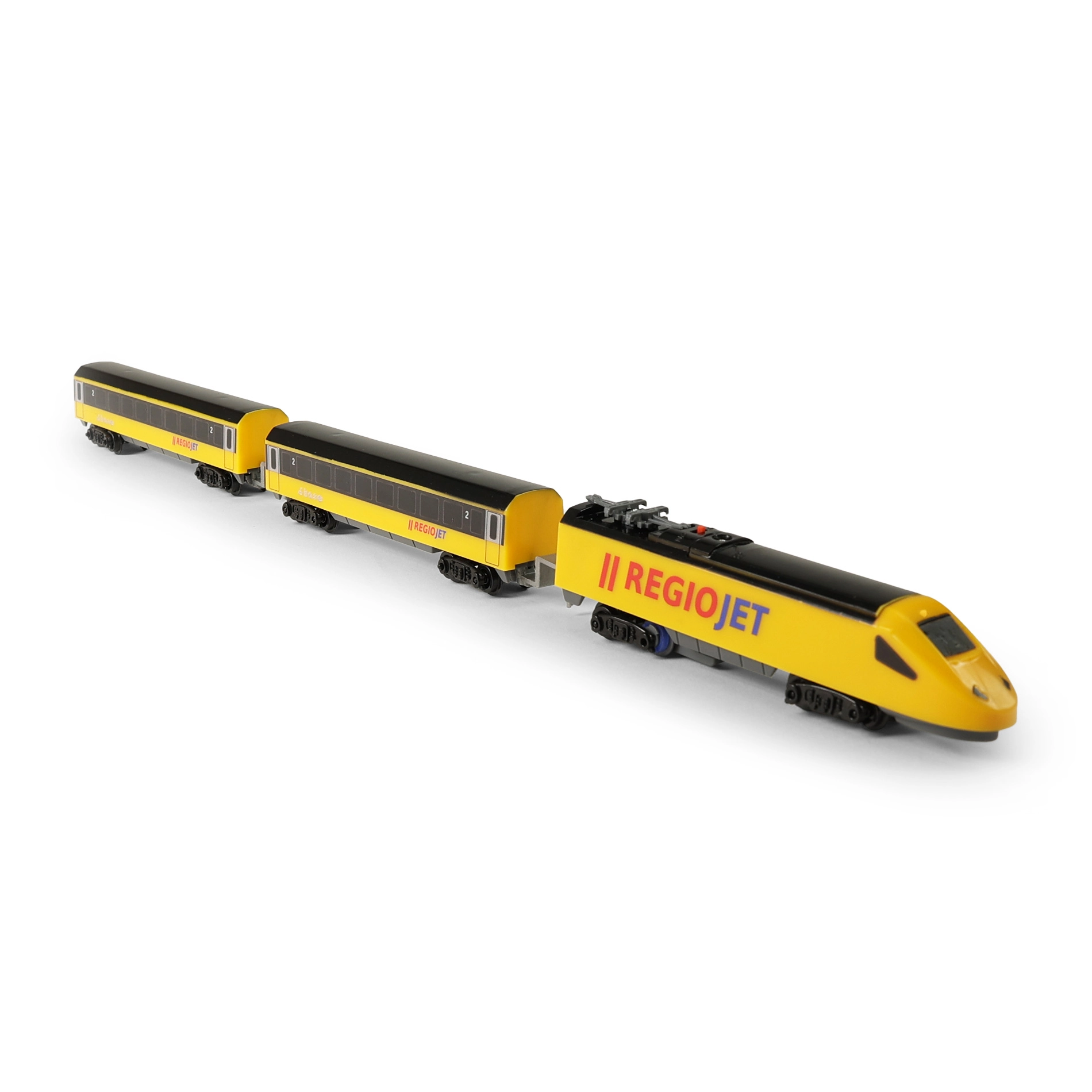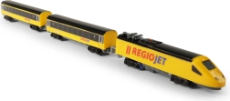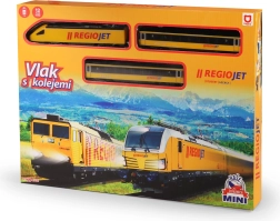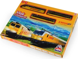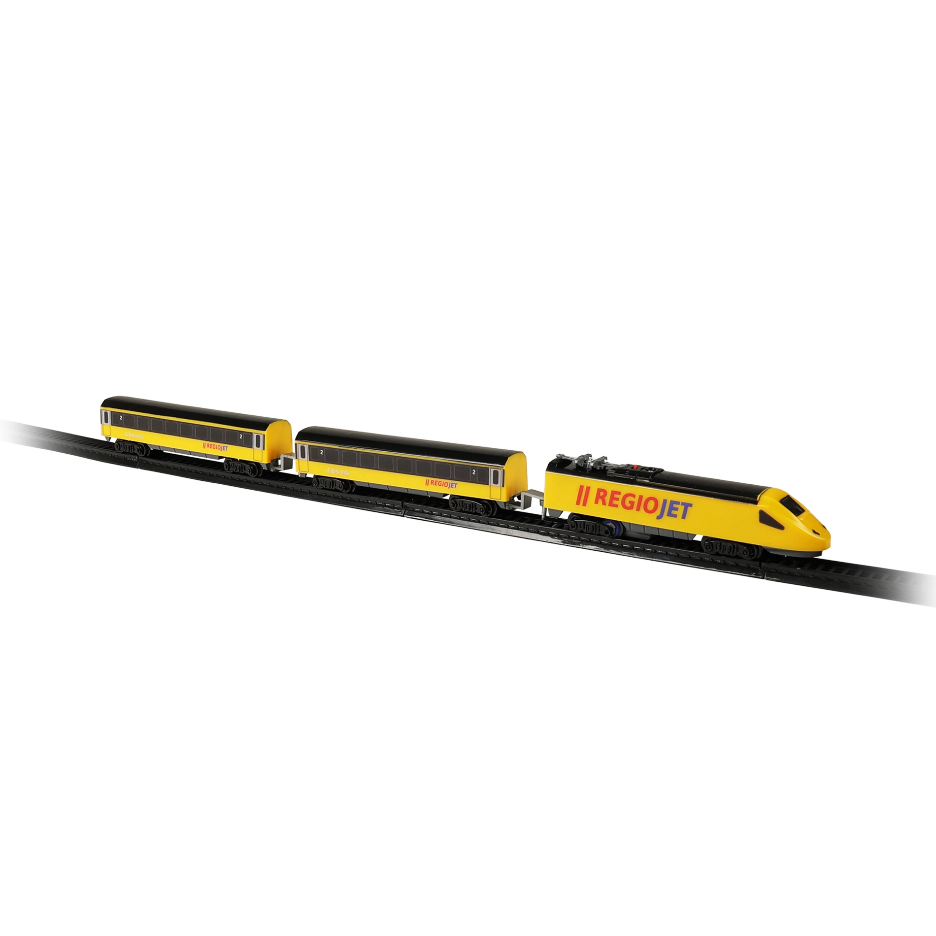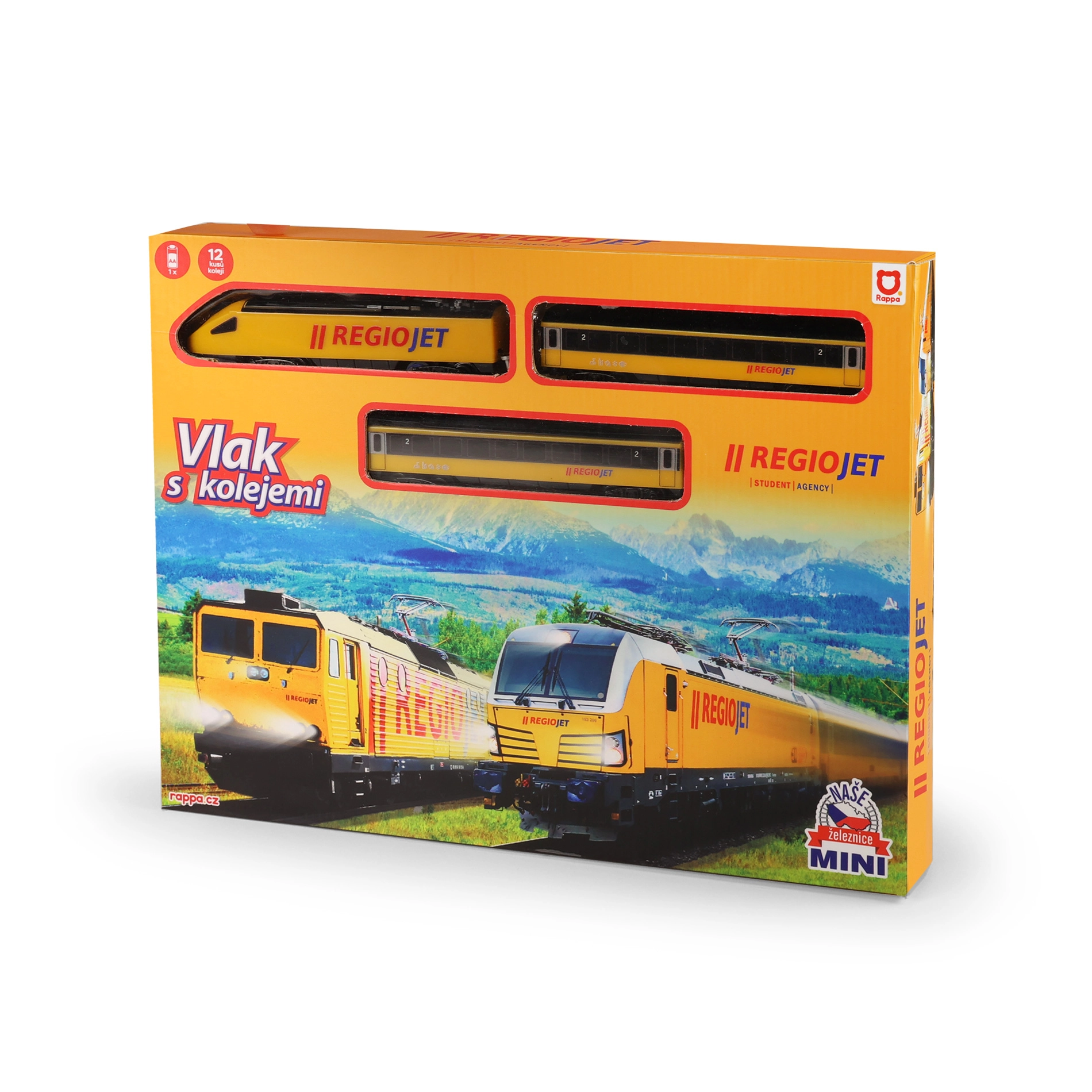 Ontdek de lol van treinen met de compacte RegioJet MINI-set. De gele locomotief met twee wagons rijdt over een modulaire spoorbaan die je eenvoudig opbouwt uit 8 gebogen en 4 rechte delen. Dankzij de praktische schakelaar op het dak van de locomotief is de bediening heel eenvoudig, zodat kinderen snel kunnen beginnen met spelen.