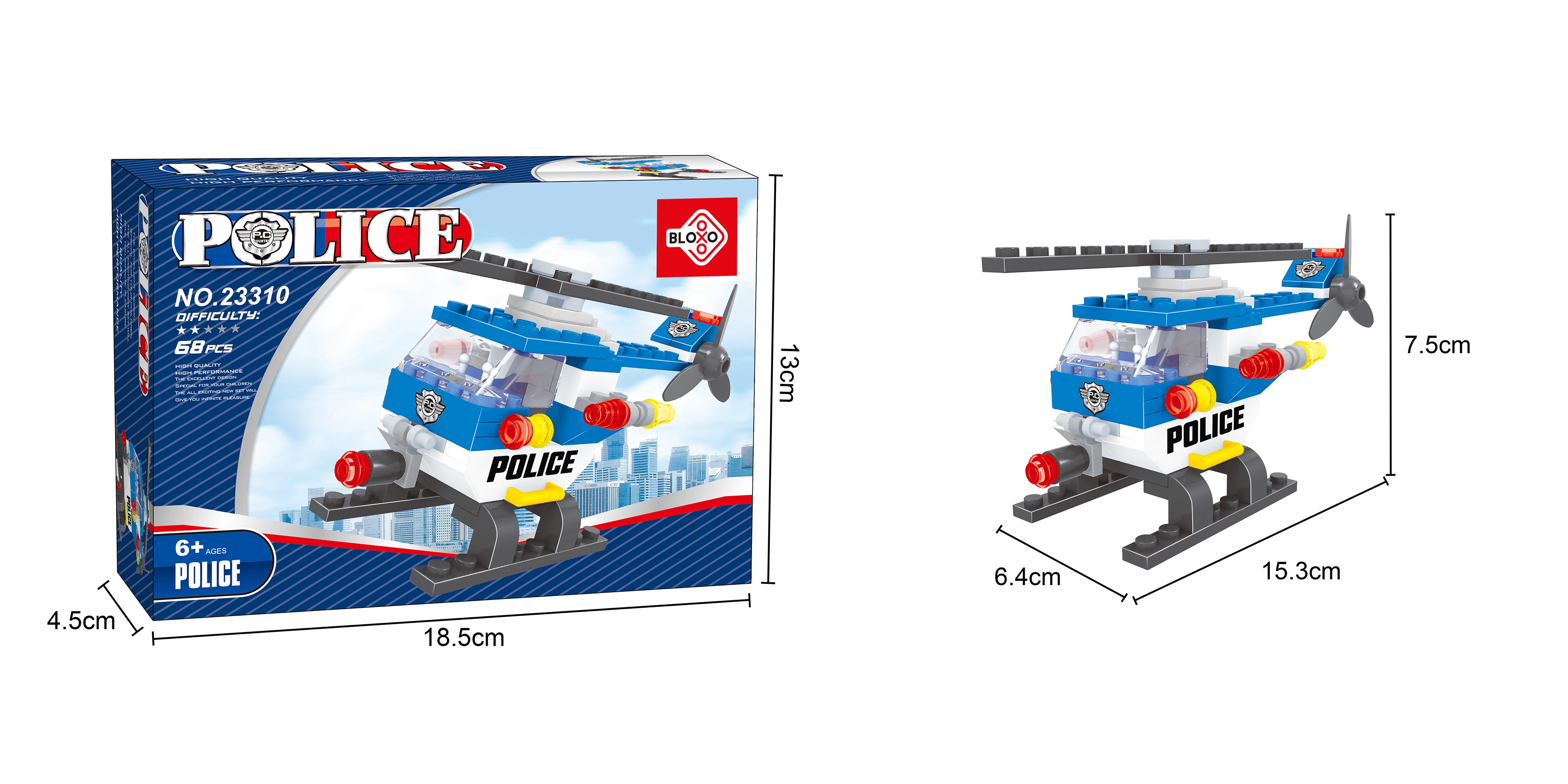 De BLOXO Politie Helikopter bouwset biedt kinderen tegelijk plezier en leren. Met 68 zorgvuldig ontworpen onderdelen bouwen ze een stijlvolle politiehelikopter en kunnen ze op spannende luchtmissies, zoekacties en achtervolgingen gaan.