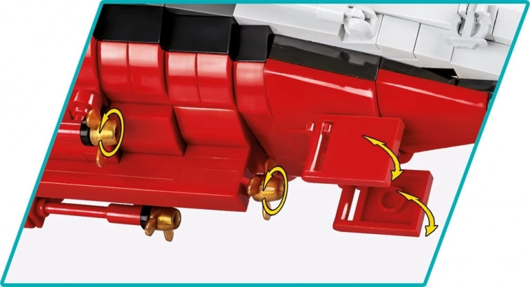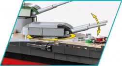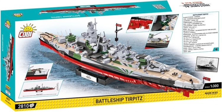 Dankzij geavanceerde bouwtechnieken en nieuwe elementen kun je rekenen op bewegende schroeven en roeren, draaibare torens en hefbare/neerlaatbare lopen. Inclusief een robuuste zwarte standaard met een gedrukte plaquette “Tirpitz”. Voor deze bouwset is geen lijm of verf nodig – je bouwt alles uitsluitend met COBI-stenen, die compatibel zijn met andere merken.
