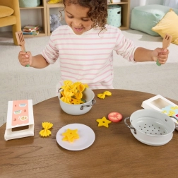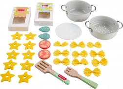 De Fisher-Price set voor kleine koks bevat 31 onderdelen voor realistisch kookspel. Kinderen kunnen pasta koken, afgieten en serveren dankzij metalen pannen met een vergiet, houten keukentools en vilten pasta in twee vormen. De houten onderdelen zijn gemaakt van FSC-gecertificeerd hout en stimuleren fantasie en rollenspel.