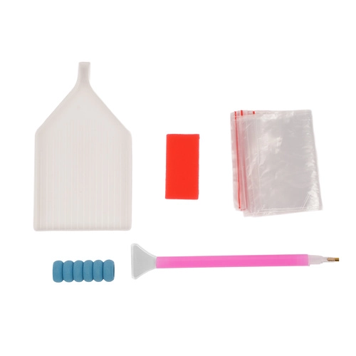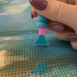 Het geribbelde bakje, de applicator en de was zorgen voor nauwkeurig oppakken en plaatsen van de steentjes op de juiste plekken volgens de symbolen op het canvas.