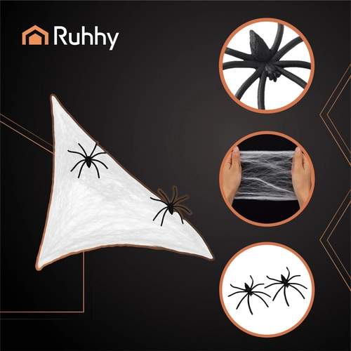 Creëer een rillingwekkende sfeer tijdens Halloween met de RUHHY-decoratie – een uitrekbaar kunstmatig spinnenweb en 2 zwarte spinnen. Het lichte en elastische materiaal hecht gemakkelijk aan verschillende oppervlakken en maakt het eenvoudig om snel een realistisch spinnenweb te creëren boven deuren, op leuningen, muren, lampen of tafels. Ideaal voor Halloweenfeesten, thema-evenementen, scenografie en huisdecoratie.