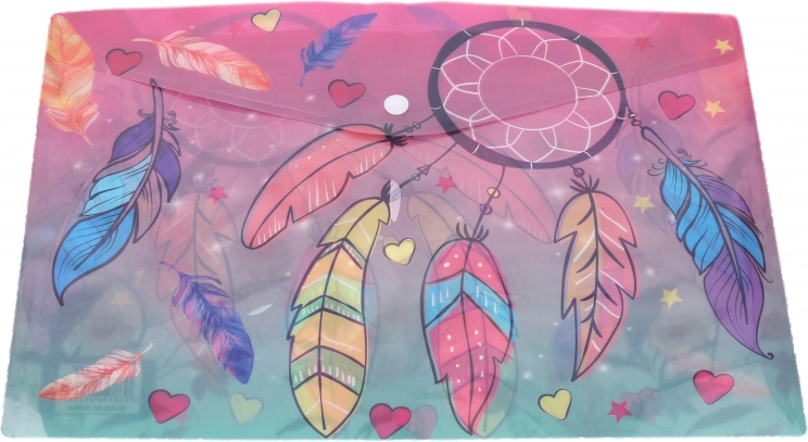 De mappen worden geleverd in een aantrekkelijke mix van motieven – bloemen, vlinders of dromenvanger – en zijn geschikt voor scholieren, studenten en op kantoor. Ze openen en sluiten gemakkelijk met een stevige drukknoop, zodat alles op zijn plaats blijft, ook onderweg.