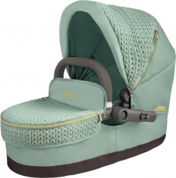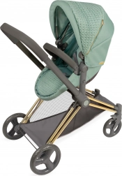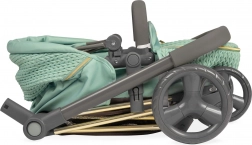 Deze stijlvolle poppenwagen valt op door de combinatie van moderne mintgroene stof en decoratieve details, waaronder gouden accenten. Dankzij het doordachte ontwerp schakelt u gemakkelijk tussen de diepe wieg en de sportstand. De hogere duwbeugel (73 cm) zorgt voor comfortabel rijden, ook voor kleuters.