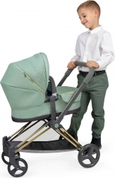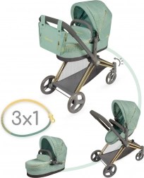 Elegante 3-in-1 poppenwagen uit de CAPRICCIO-collectie in een moderne mintgroene kleur, met een reiswieg, sportzitje en draagbare kuip. Voorzien van een verstelbare kap, zwenkbare voorwielen voor eenvoudig manoeuvreren, een opbergmand en een afneembare tas met gouden ritsen. Dankzij het opvouwbare frame neemt hij weinig ruimte in en is hij ideaal voor kinderen vanaf 3 jaar.