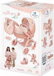 Elegante kinderpoppenwagen uit de Tulipe-collectie met 3-in-1 gebruik – reiswieg, sportstand en draagtas. Dankzij de zwenkbare voorwielen, de verstelbare duwbeugel van 70 cm en het inklapbare frame is de wagen makkelijk te besturen en ideaal voor onderweg. Het stijlvolle design in warme pasteltinten met bloemmotief wordt aangevuld met een afneembare tas in de vorm van een tulp en doordachte details voor comfortabel speelplezier.