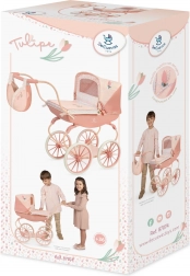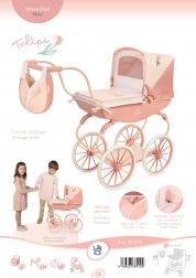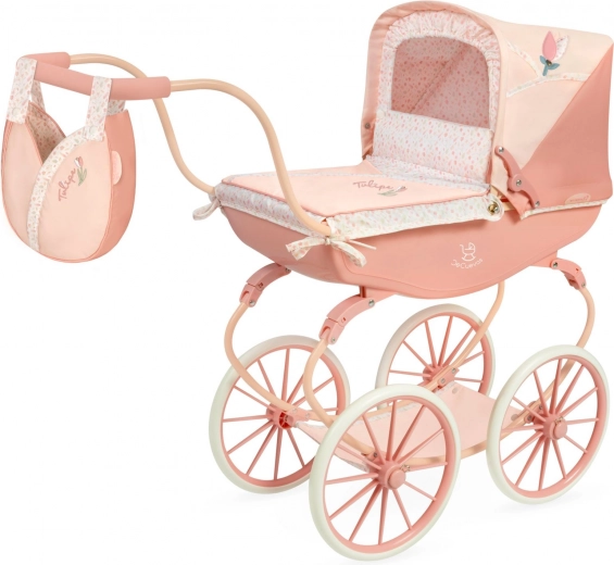 Warme pasteltinten met een subtiel bloemenmotief en de iconische tulpvormige tas maken van deze poppenwagen een echte blikvanger.