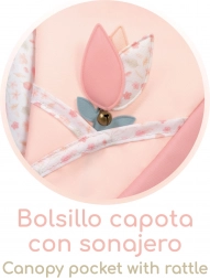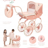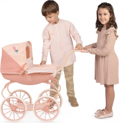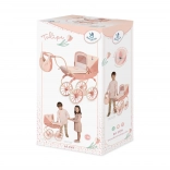 De diepe poppenwagen uit de Tulipe 2025-collectie blinkt uit door de precieze afwerking en de mooie combinatie van lichtere en donkerdere zalmroze pastels met een subtiel bloemenmotief. Dankzij de veren voor schommelen en het zachte matras geniet de pop van comfortabel “slapen”, terwijl de inklapbare kap en de wiegbekleding haar tijdens wandelingen beschermen.