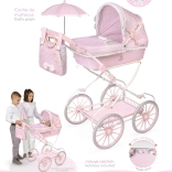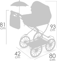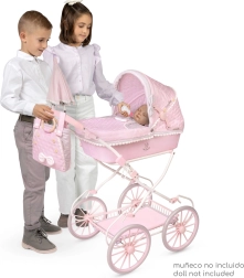 Het stabiele frame van metaal, kunststof en textiel is licht en gemakkelijk te manoeuvreren. De opklapbare kap, praktische opbergmand en verende schommels zorgen voor een realistische speelbeleving. De rijke uitrusting bevat alles voor stijlvolle uitstapjes met de pop.