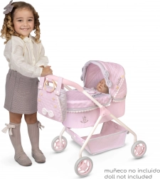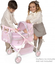 De praktische uitrusting omvat een afneembare tas voor aan de wagen of om in de hand te dragen, een wieghoes met oogjes en zakjes, een comfortabel matras en onderste opbergruimte voor kleine spulletjes. Spaans design en precisie-afwerking zorgen voor een lange levensduur en dagelijks speelplezier.