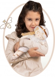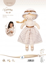 De pluchen pop Verona 36 cm is een klein vriendinnetje geïnspireerd door natuurlijke tinten en subtiele patronen, met een tijdloze uitstraling. De combinatie van lichtbeige en wit met stippen of strepen, aangevuld met fijne biezen, onderstreept het elegante Spaanse design. De pop is gemaakt van hoogwaardige, gladde, glanzende pluche die prettig aanvoelt en geschikt is voor dagelijks spelen.