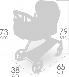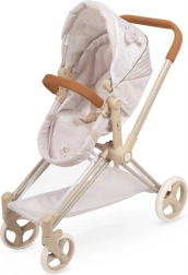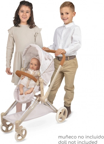 De wagen is opvouwbaar, neemt na het inklappen minimale ruimte in en is praktisch voor transport. De afneembare draagwieg maakt het mogelijk de pop veilig te vervoeren, terwijl de verstelbare kap, driepuntsgordels en zwenkende voorwielen zorgen voor comfortabel en soepel rijden. Inclusief een stijlvolle tas en een ondermand voor alles wat nodig is.