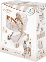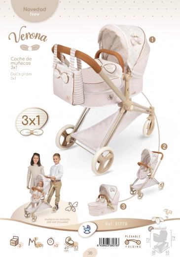 Elegante 3-in-1 poppenwagen uit de collectie VERONA met een verfijnd, natuurlijk design, opvouwbaar frame en een afneembare diepe reiswieg die kan worden omgebouwd tot een sportieve versie. Voorzien van een verstelbare kap, driepuntsgordel, zwenkende voorwielen voor eenvoudig sturen en een praktische tas en opbergmand. Een geweldige keuze voor kinderen vanaf 3 jaar.