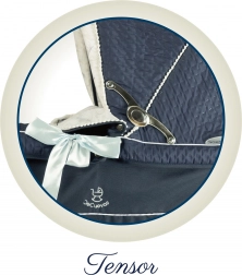 Inclusief decoratief doorgestikte tas die je aan de wagen kunt bevestigen of over de schouder kunt dragen. Uniform design in donkerblauw met witte details.