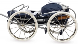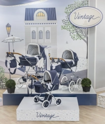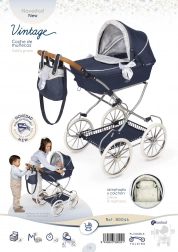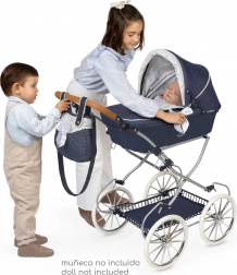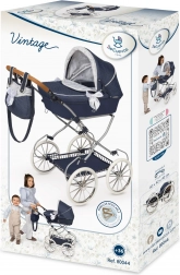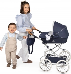 Elegante poppenwagen uit de Vintage 2025-collectie in donkerblauw met ijswit, met precisie afgewerkt, klassieke charme en een inklapbaar frame. Biedt een in hoogte verstelbare duwbeugel van 52–81 cm, een ruime wieg met doorgestikte cover, een opbergmand en een stijlvolle schoudertas. Ideaal voor grotere meisjes en kleine verzamelaars.
