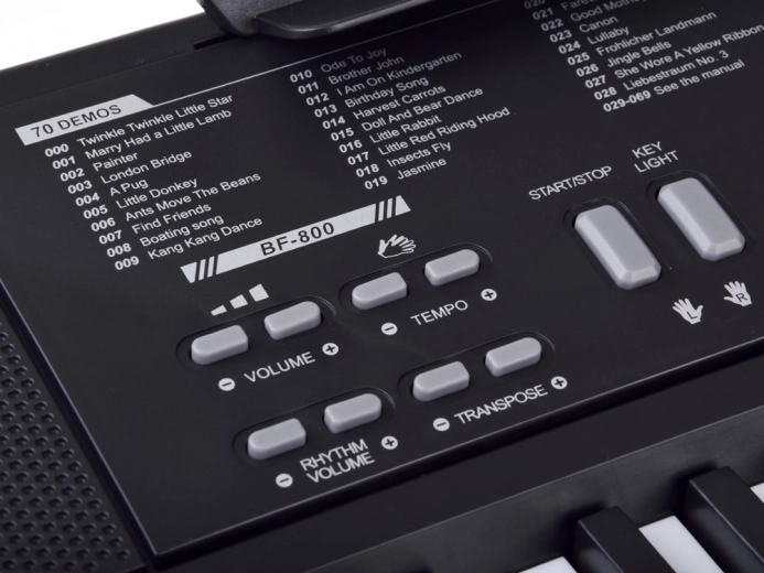 - Start/Stop, Key Light, Volume, Tempo, Transpose, Record/Play, Demo, Numeric Pad