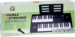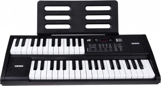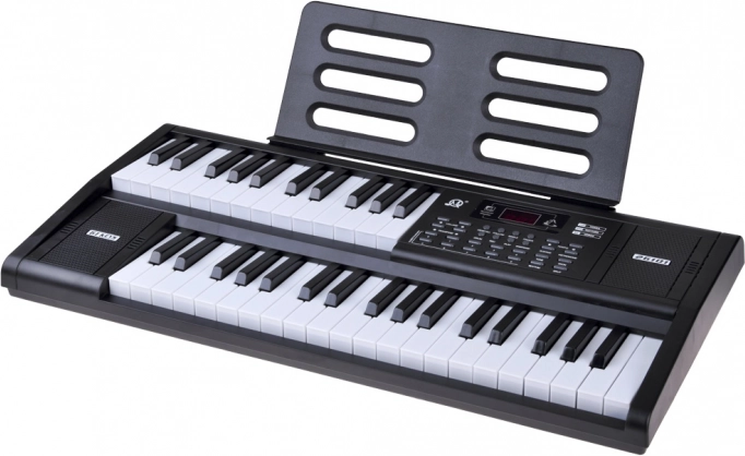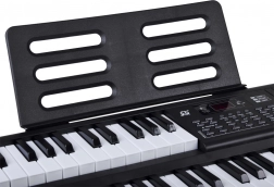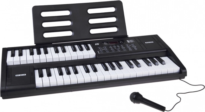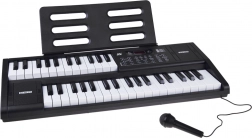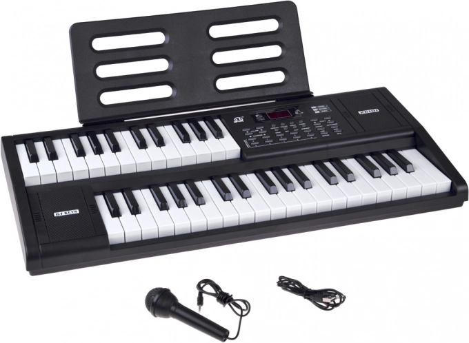 In de doos vind je een microfoon en een bladhouder. Het keyboard is compact, met ingebouwde luidsprekers en eenvoudige bediening – ideaal voor thuis musiceren, begeleidingsoefeningen en je eerste eigen composities.