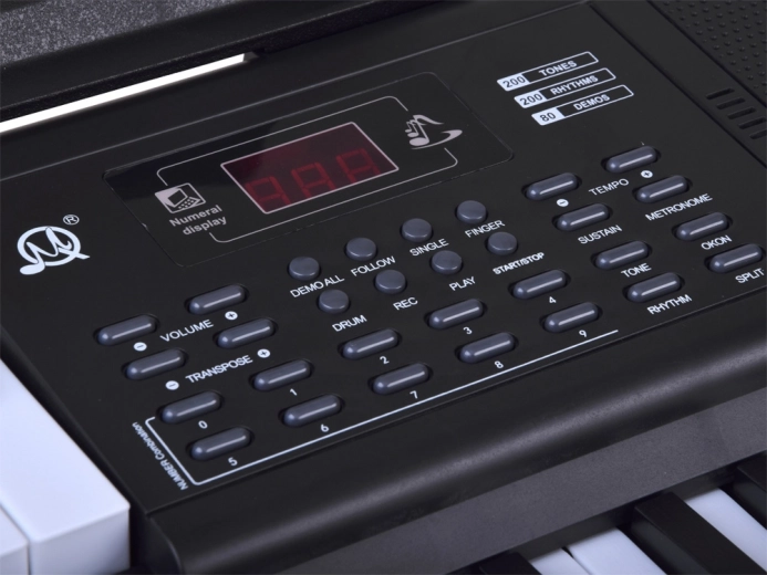 Voor inspiratie zijn er 200 tonen van piano’s en orgels tot strijkers en blazers, 200 begeleidingsritmes (pop, rock, jazz, disco) en 80 demo‑nummers. Praktische functies zoals metronoom, transpose, sustain, REC/PLAY en de leermodus FOLLOW ondersteunen zowel leren als plezier.
