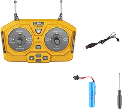 De 2,4 GHz afstandsbediening met 10 kanalen maakt vloeiend vooruit/achteruit rijden, sturen, heffen en laten zakken van de laadbak, bediening van de lichten en geluidseffecten mogelijk. De geïntegreerde Li‑Ion-accu van 7,4 V / 2000 mAh zorgt voor tot 45 minuten bedrijfstijd en een bereik van ongeveer 30 meter.